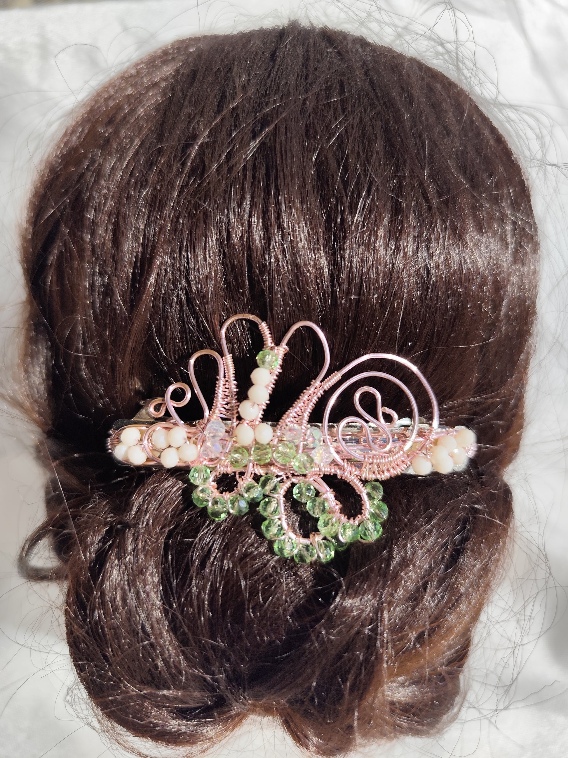 ✨ Pasador artesanal en alambre dorado con cuentas de cristal.